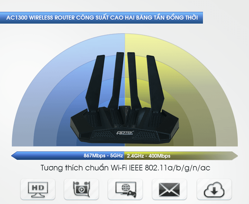 APTEK A134GHU trang bị 4 anten, băng tần kép hỗ trợ công nghệ MU-MIMO và bộ khuếch đại công suất cao bảo đảm tốc độ đường truyền ổn định, duy trì tốc độ cao với khoảng cách xa hơn.