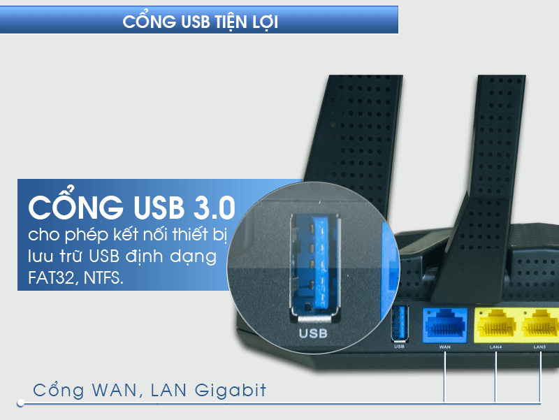 Cổng USB 3.0 cho phép kết nối thiết bị lưu trữ USB định dạng: FAT32, NTFS.