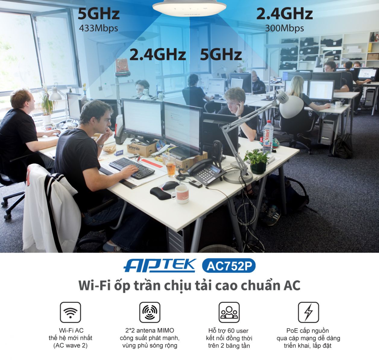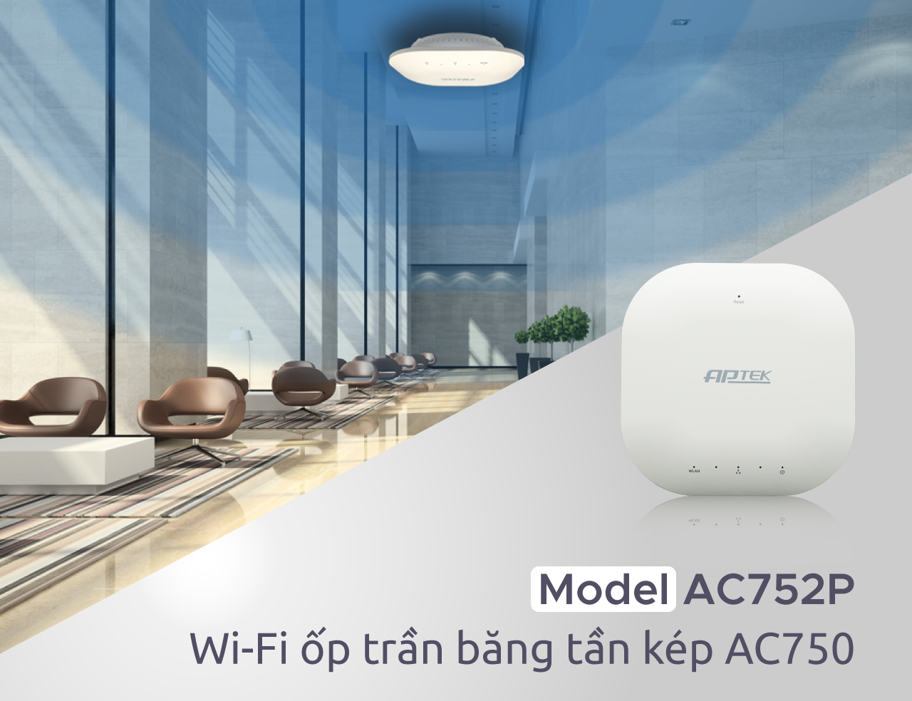 Bộ phát Wi-Fi APTEK AC752P phát sóng 2 băng tần 2.4GHz và 5GHz, công suất phát mạnh cho phép tín hiệu xuyên tường mạnh mẽ và vùng phủ sóng rộng, chuẩn Wi-Fi 802.11 a/b/g/n/ac mới nhất (450Mbps/2,4GHz và 867Mbps/5GHz), 802.11 N/AC mới nhất (2.4GHz chuẩn N tốc độ 300Mbps, 5GHz chuẩn AC tốc độ 433Mbps)