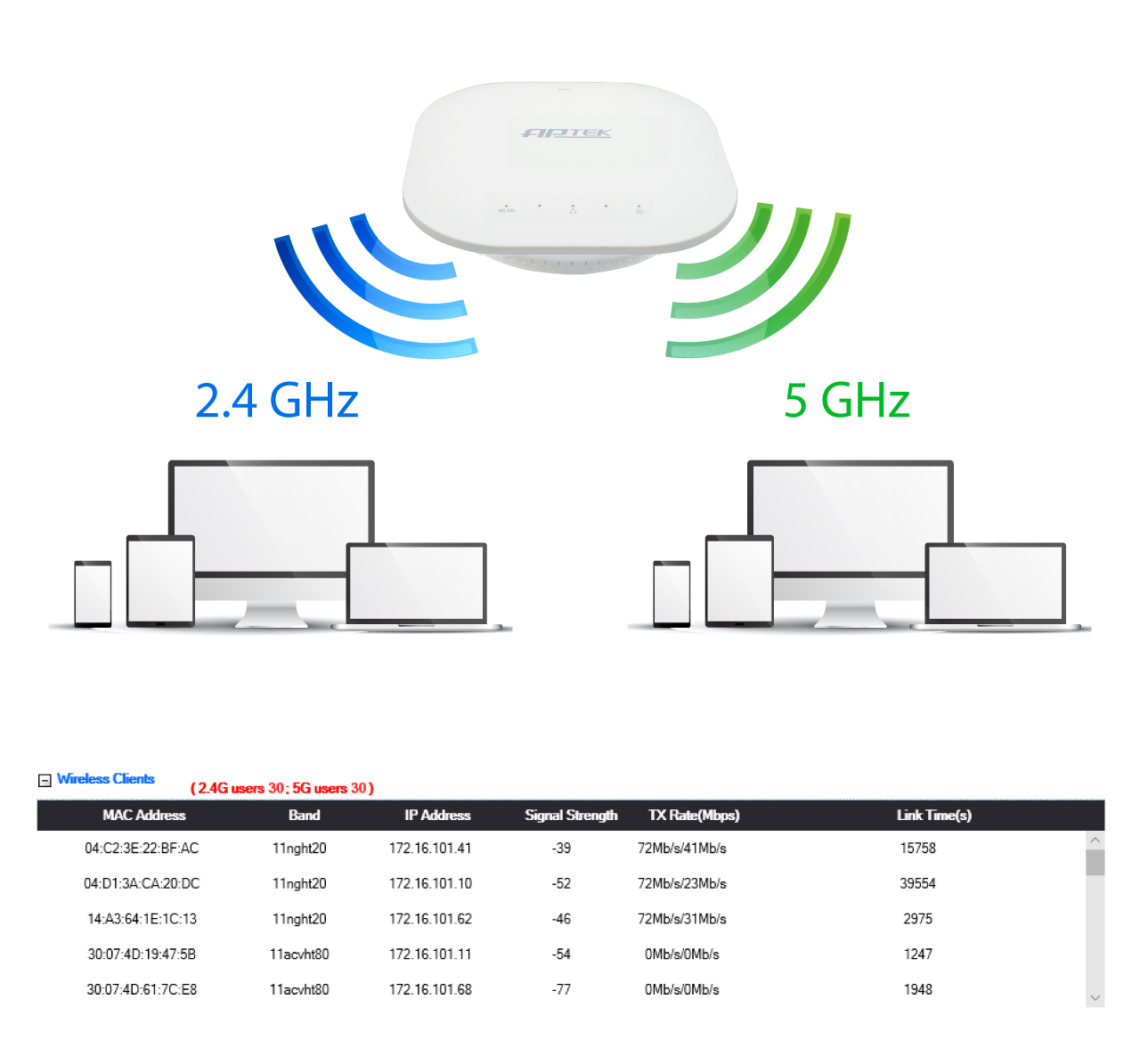 Bộ phát Wi-Fi APTEK AC752P cho phép 60 thiết bị kết nối đồng thời trên 2 băng tần 2.4GHz và 5GHz