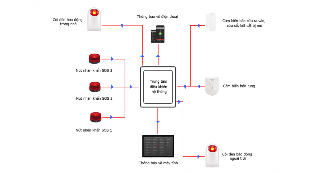- Trung tâm báo động: Cơ quan đầu não của hệ thống với vai trò tiếp nhận tín hiệu từ các cảm biến, sau đó xử lý tín hiệu, truyền thông tin tới thiết bị đầu ra (còi, đèn cảnh báo) và tin nhắn tới các số điện thoại đã được cài đặt sẵn.